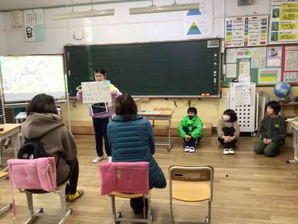 5年生は、恩真寺湿地と学校の自然を比較調査したことを発表しました。