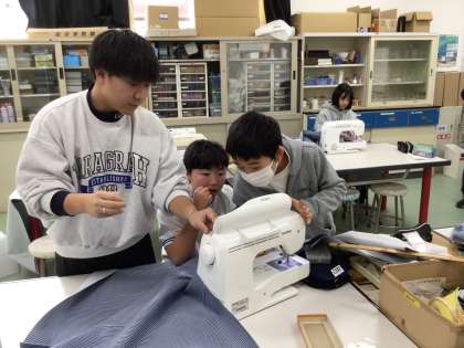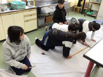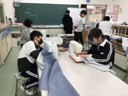 これまでの家庭科で身につけた技能を使って、学校へ贈る「配膳台カバー」を製作していました。