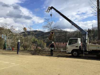 運動場と校舎の間の斜面に残っていた樹木の根元部分について、危険であると判定されたので、今日は業者さんに来てもらい伐採しました。