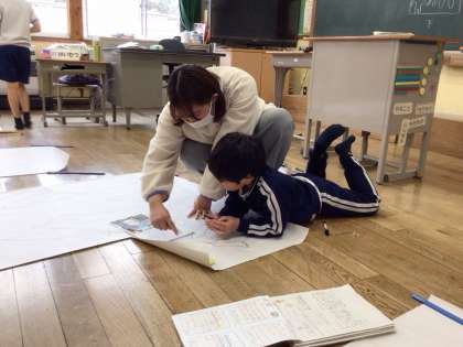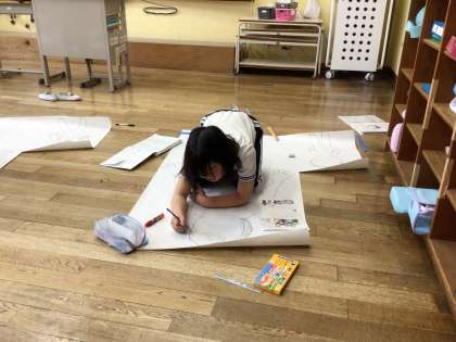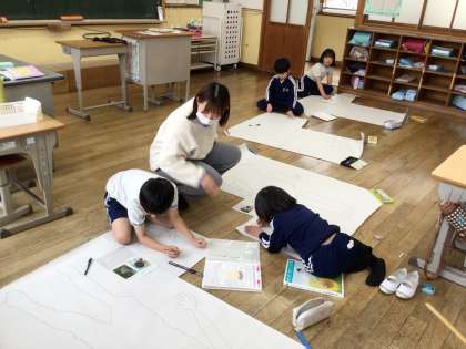 調べたことをもとに、生まれた時と今の等身大の自画像を描いていました。