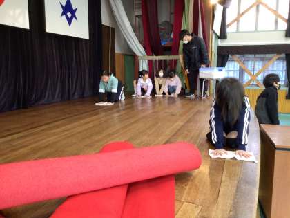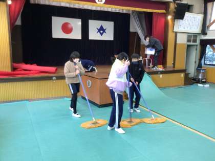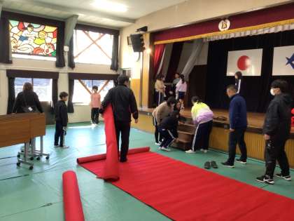 3、4、5年生は、集会室で卒業式の会場づくりをしました。
