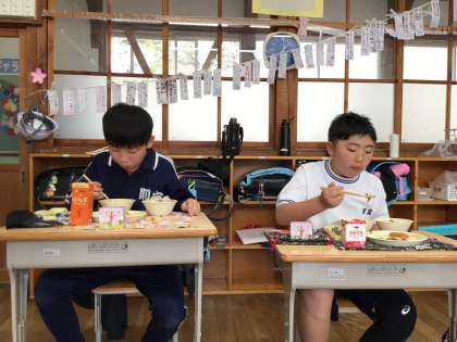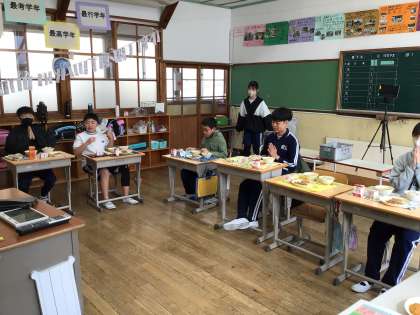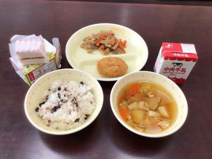 赤飯、かしわ汁、えびカツ、れんこんのきんぴら、米粉のケーキ、牛乳が提供されました。