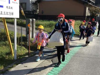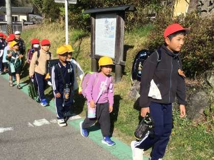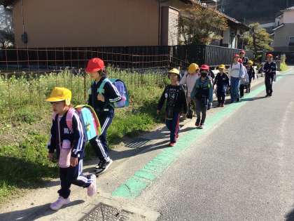 子ども園の頃はお家の人と一緒に通園していた1年生も、今日からはお兄さん、お姉さん豊田市一緒に歩いて登校します。