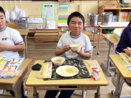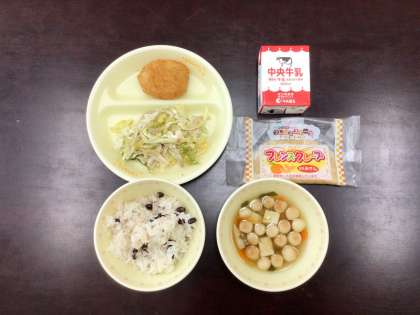赤飯、ふだま汁、えびカツ、ごぼうサラダ、みかんクレープ、牛乳が提供されました。