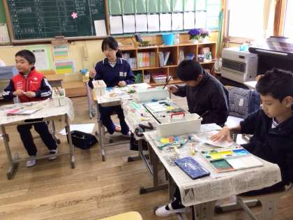作品づくりの途中では、友達と作品を見合って、その良さや感じたイメージを伝え合っていました。