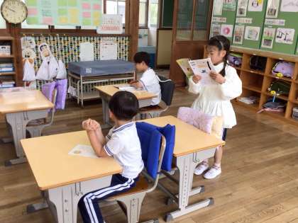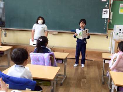 2年生は「風のゆうびんやさん」、1年生は「あひるのあくび」「あかるいおひさま」を音読しました。