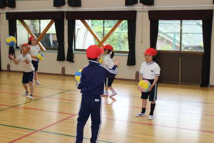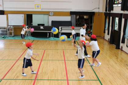 朝の活動でチェレンジタイムを行いました。低学年は、リズム運動とボールを使ったCOT(コーディネーショントレーニング)で楽しみながら体を動かしました。