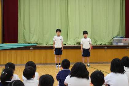 本日は、第2回のスピーチ集会。3年生の2人がスピーチしました。声が大きく、みんなに届く声だったり、全校のみんなに問いかける話し方の工夫だったりとレベルの高いスピーチでした。
