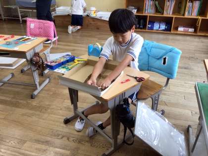段ボールの板を切ったり組み合わせたりして、自分の好きな世界を作っていました。