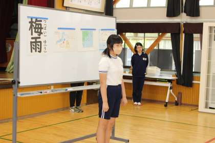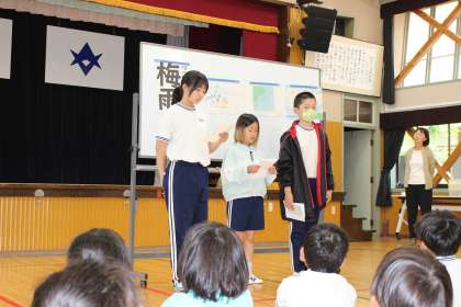 雨の日はじっくり本に親しもうということで、ライブラリー委員会が「あじさい読書祭り」のPRをしました。