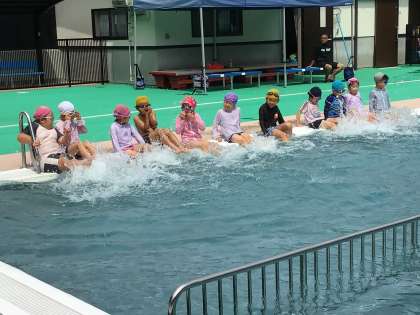 1年生にとっては初めての、2年生以上にとっても久し振りのプールなので、プールサイドに座ってゆっくりと水慣れをしました。