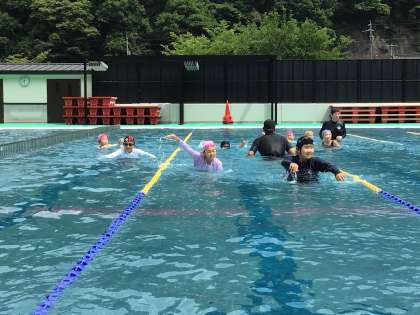 水に慣れてきたところで、プールの中に入って水中を歩きました。