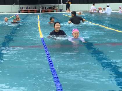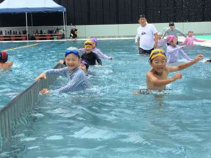 2回目の水泳学習のため、全校で足助プールに出かけました。
