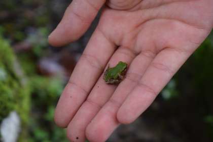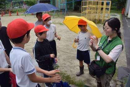 今日は、自然観察の森から講師の方をお招きし、事前学習を行いました。雨もちょうど止んでいたので、校庭で生き物探しをしました。