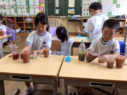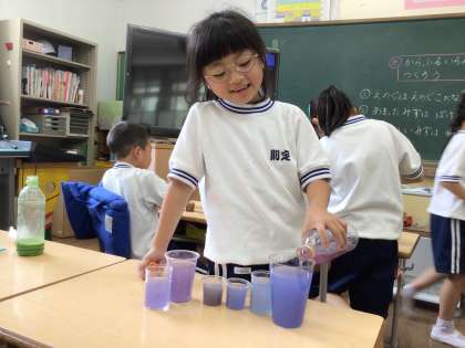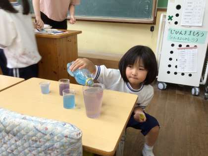 お気に入りの色水を並べたり、新しい色を作ったりしながら、楽しそうに活動していました。