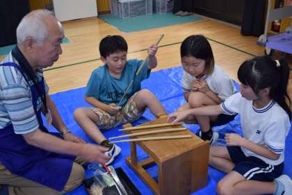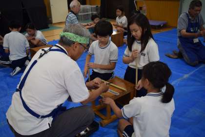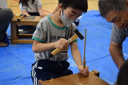 今日は、ものづくりサポートセンターの方を講師にお招きし、空気てっぽうづくりを行いました。竹の特徴や空気てっぽうの仕組みを教えていただきました。