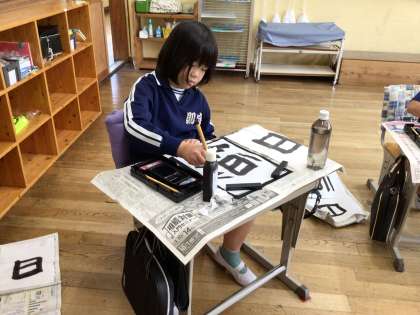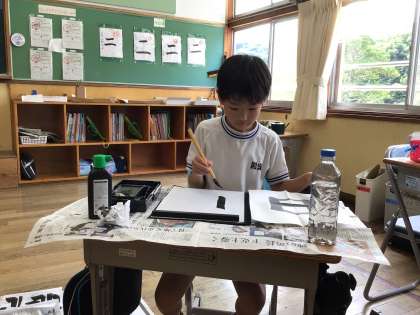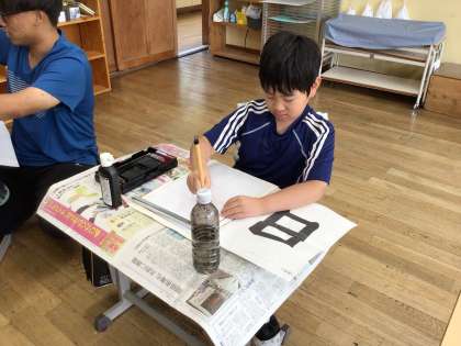 毛筆で「日」を書いていました。