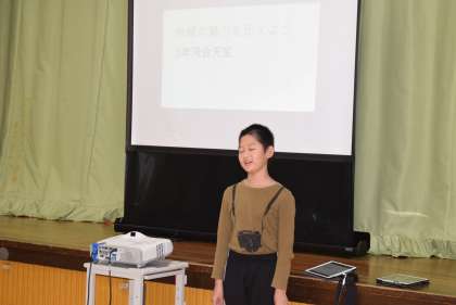本日は、集会の中でスピーチがあり2名が話しました。地域の魅力として、ヒメタイコウチや則定小学校の歴史のことを取り上げて紹介しました。