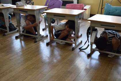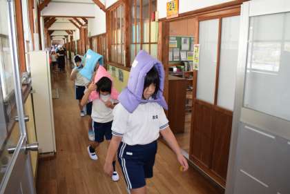 2時間目には、シェイクアウト訓練を行い、揺れが収まった後、安全な場所に避難する訓練も行いました。