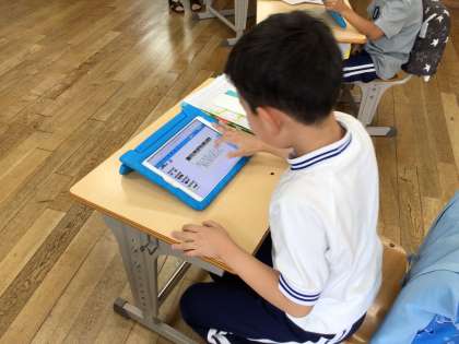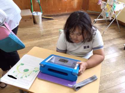 ICT支援員さんに教えてもらい、タブレットを使ってカボチャの観察記録を作成していました。