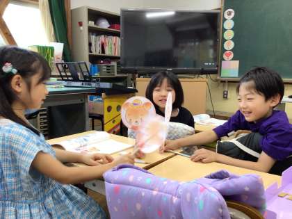 「かいがら」のお話に出てくる、「くまの子」と「うさぎの子」になりきって、お話をしていました。