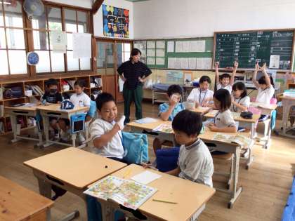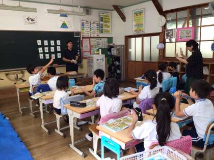 ALTの先生が提示するアルファベットを見て、一喜一憂する4年生です。