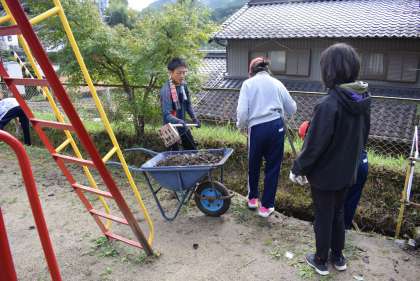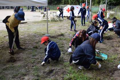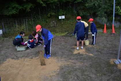 みなさんのがんばりで、予定時間よりも早く終了しました。運動会に向けて運動場もきれいに整備されました。