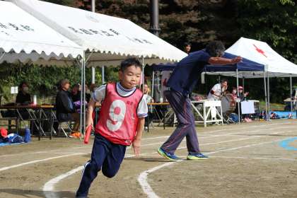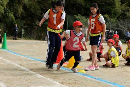 赤白それぞれが2つのチームをつくり、バトンをつなぎました。