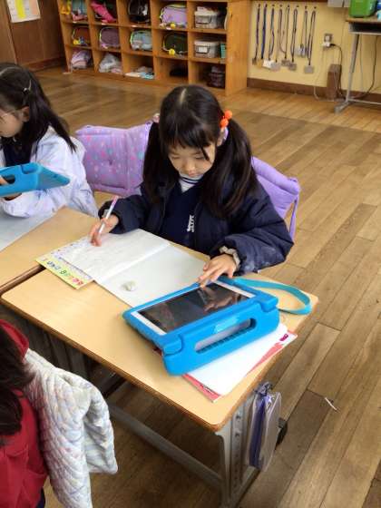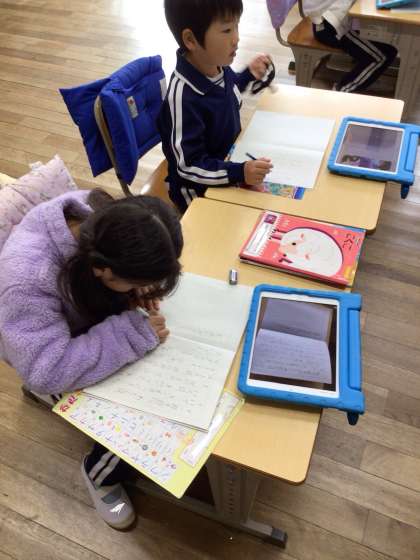 1年生 国語「はっけんしたよ」 公開日 2025/11/12 更新日 2025/11/12 各学年から 1年生の国語で学習用タブレットを見ながらノートに書く学習をしました。一度、下書きをしたものを先生が直して今日は清書。先生が直した部分を学習用タブレットで写真を撮り、それを見ながらみんな集中して丁寧に書きました。 1年