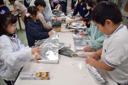今日は、全校で収穫したさつまいもで焼きいも会を行いました。朝からいもを洗い、新聞紙、アルミホイルで包み、焼く前の準備をしました。