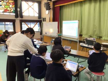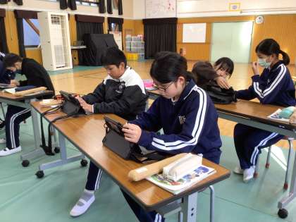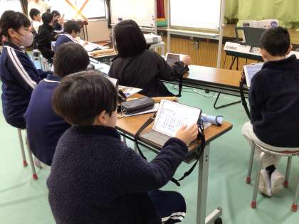 学習用タブレットを使って自分の音を選び、演奏を聞きながら、自分なりの工夫を加えていました。
