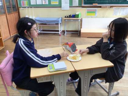 学習後は、教材のポテトチップスをカロリーを考えて、半分こにして食べました。