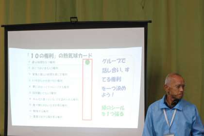 10の権利があり、その権利を1つ削る設定でグループのみんなで話し合いました。「勉強する権利」を削る考えもあれば、「清潔で好きな服を着る権利」を削ってもよいなど様々な意見が出ました。