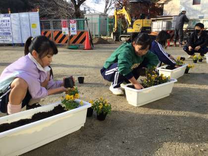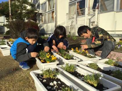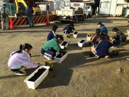 5年生の呼びかけに応じて、各学年でビオラの苗をプランターに植え替えています。