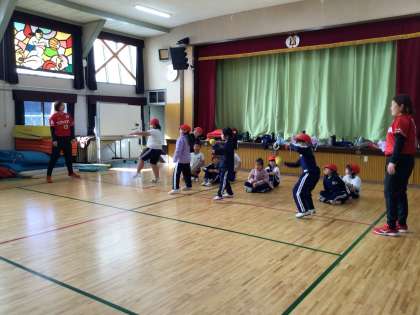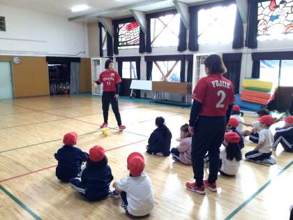 本日はトヨタ自動車女子ソフトボール部から2名の講師をお招きし、投げ方教室を行いました。投げ方の基礎基本や投げるときのコツとして足を出す方向や利き手と反対の手の位置などを教えていただきました。子どもたちはすぐにコツをつかみ、たくさんボールを投げました。とても貴重な時間となりました。