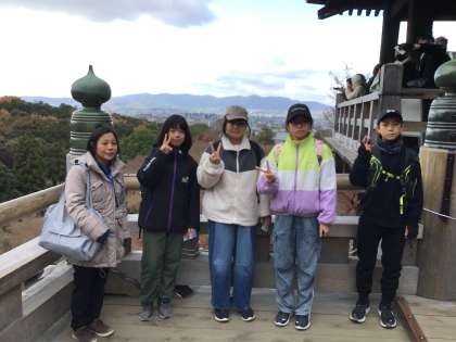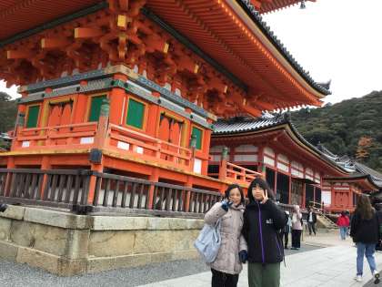 清水の舞台では、笑顔で記念写真を撮りました。