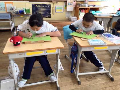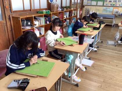 彫刻刀の刃の種類による彫りの違いを確かめながら、いろいろな彫り方を試していました。