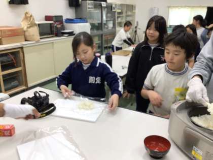 自分たちで収穫した「則定っ子米」を炊いて、おにぎりを作りました。