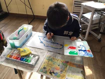 刷った紙の裏側から絵の具で着色し、彫った線に色がつきました。