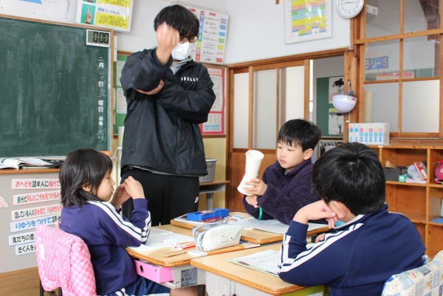 簡易な模型をつかって、筋肉と腕の動きを関係づけて学んでいました。