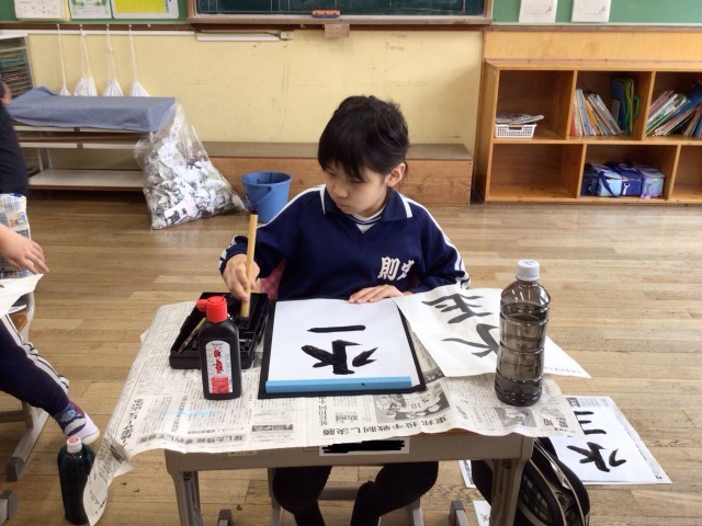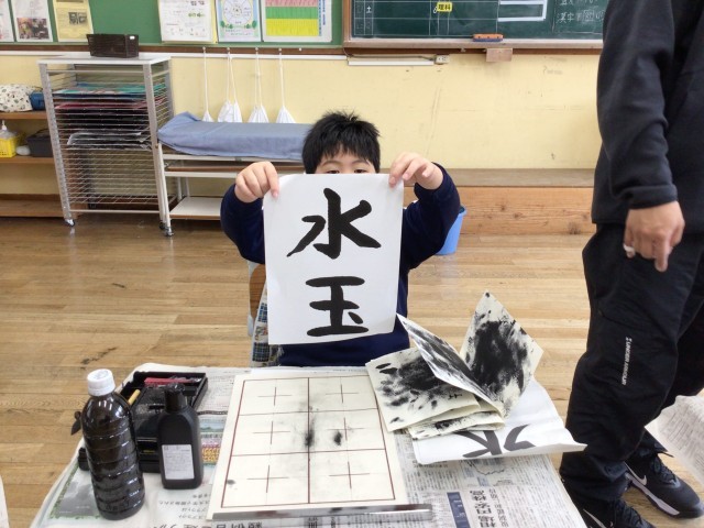 3年生で習った、「とめ」や「はね」、「はらい」などの技能を使って、「水玉」を書いていました。