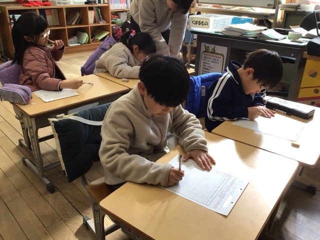 生活科で「できるようになったこと がんばったこと」をプリントに書き出し、ご褒美シールを貼っていました。それぞれに書く内容は違いますが、今は時期的に卒業式の練習に取り組んでいるので、そのことを書いている子もいました。改めて1年間を振り返るとみんなできるようになったことがいっぱいありました。