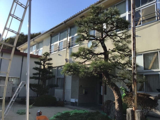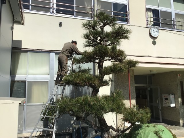 一年に一回、卒業式の前に、玄関の松を整えてもらっています。