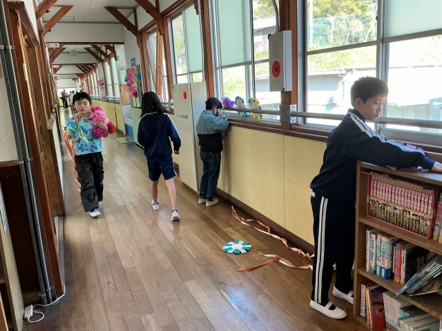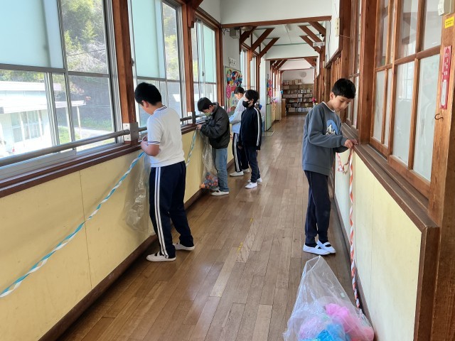 同じ頃、5・6年生が手分けして、廊下や階段の飾り付けの片付けをしていました。
