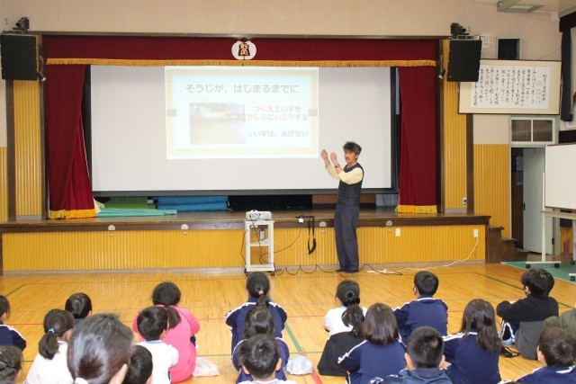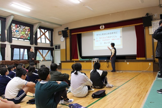 今日は、そうじ集会を行いました。自分たちの学校を自分たちの手できれいにするために、正しいそうじの仕方(ほうきのはき方や雑巾の拭き方等)を確認しました。