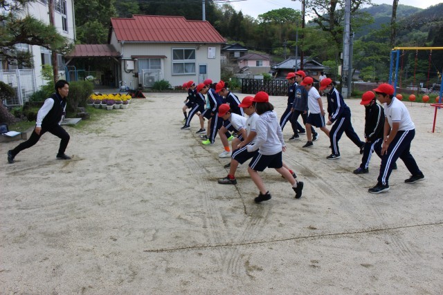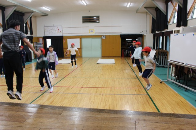 今日は、低学年が集会室で「跳躍力を高める運動」、中学年が運動場で「投げる運動」、高学年が校庭で「素早く動く運動」に取り組みました。