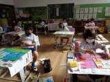 10月28日(金)、1年生は読書感想画の色塗りに入りました。クレヨンで描いたと...