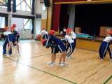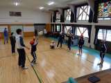 集会室で体育の授業をしました。 二人一組のストレッチの後、フラフープを使った運...