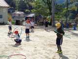 校庭で、フラフープなどの器具を使った運動に取り組みました。