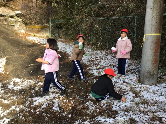 地面にはほとんど積もらなかった雪。それでも運動場では1年生と5年生が一緒に雪遊びを楽しんでいました。日陰や木々の枝に残る雪をかき集めては、雪合戦をしていました。